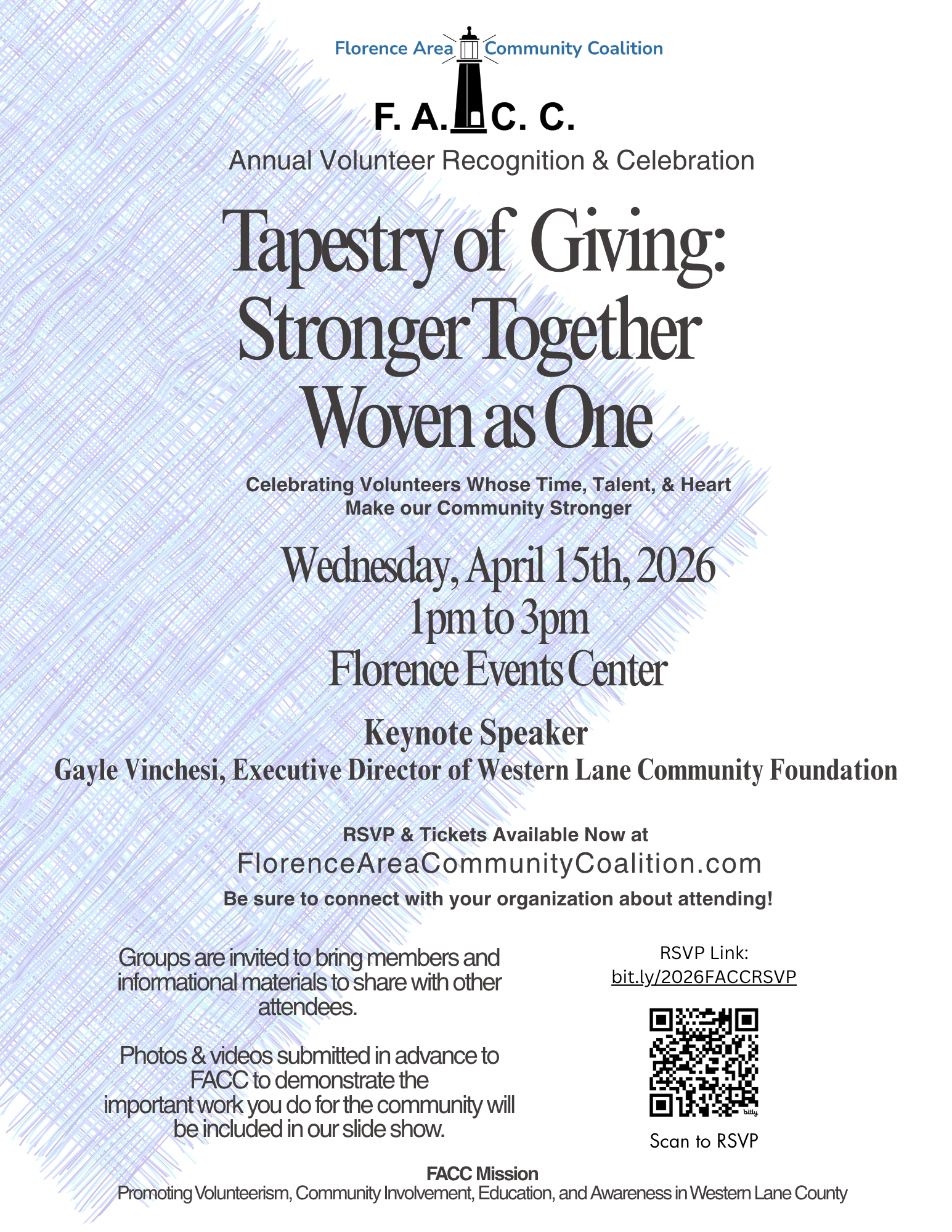 Florence Area Community Coalition hosts an annual volunteer celebration event. This year the celebration will be April 15th at the Florence Event Center. We hope to see you there.
