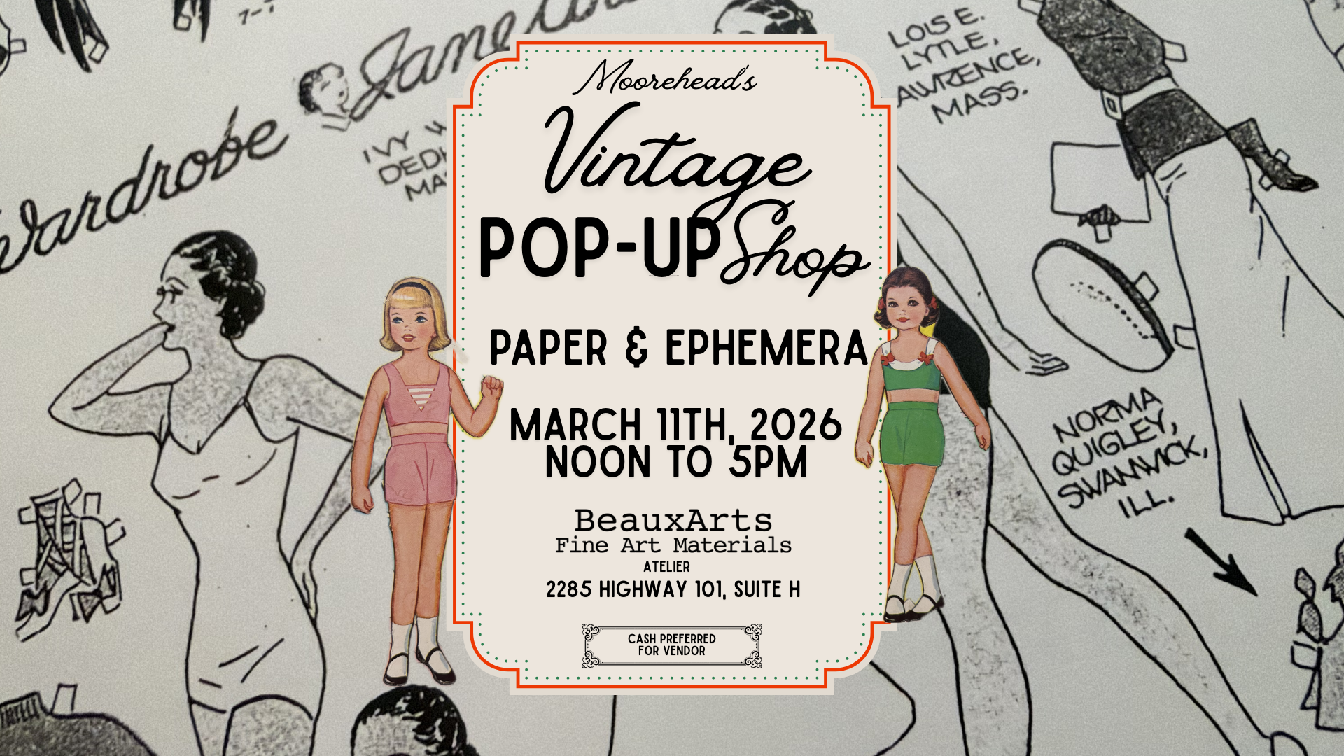 Explore Tables Filled with Paper Goods and Ephemera: Come Dig, Discover, and Leave Inspired Moorehead's Vintage Pop Up Paper & Ephemera Shop at BeauxArts from Noon to 5pm on March 11th. CASH PREFERRED For Vendor Questions? Stop by BeauxArts Fine Art Materials