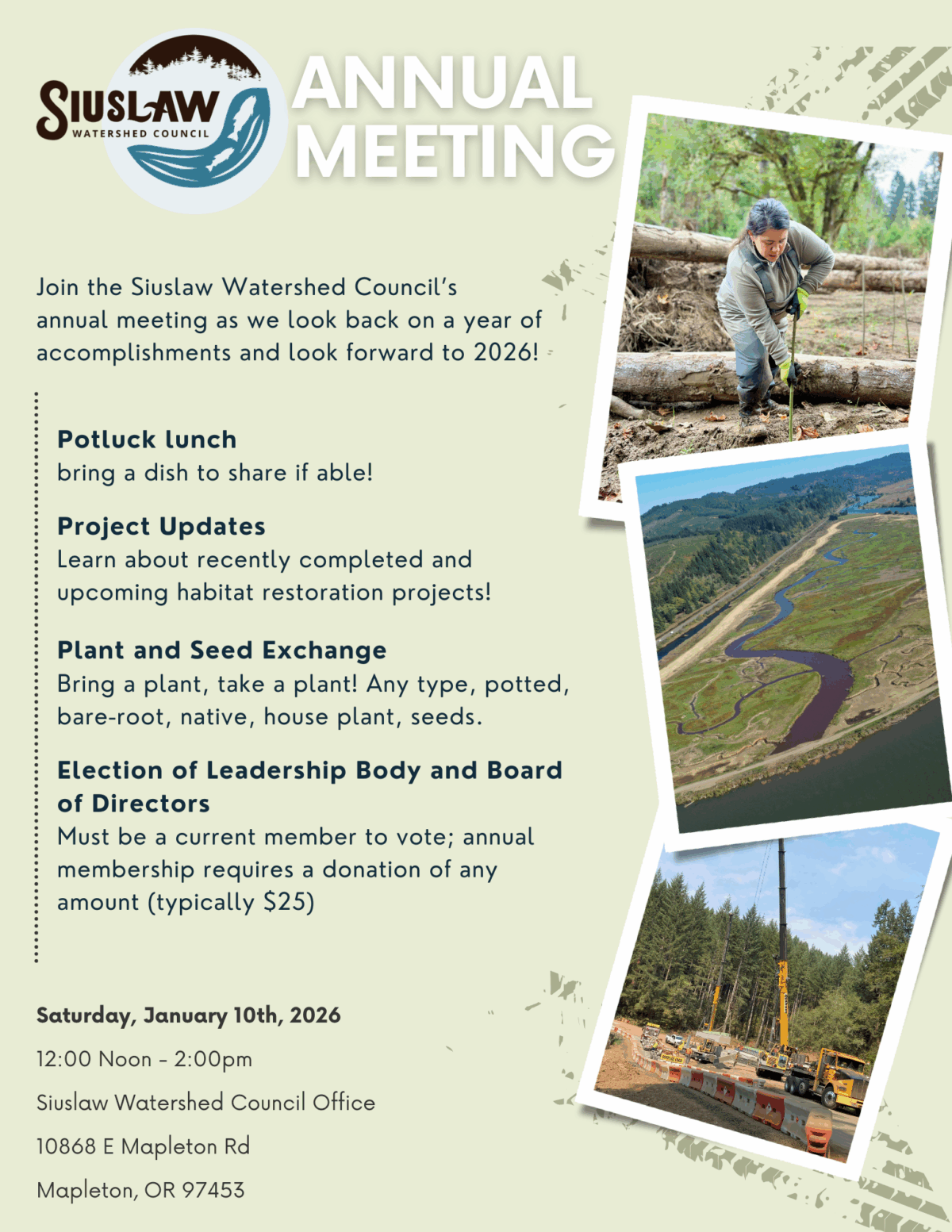 Join the Siuslaw Watershed Council for our public annual meeting as we look back on a year of accomplishments and look forward to 2026! All are welcome to join this free potluck event which will include project updates and our Leadership Body and Board of Directors elections.