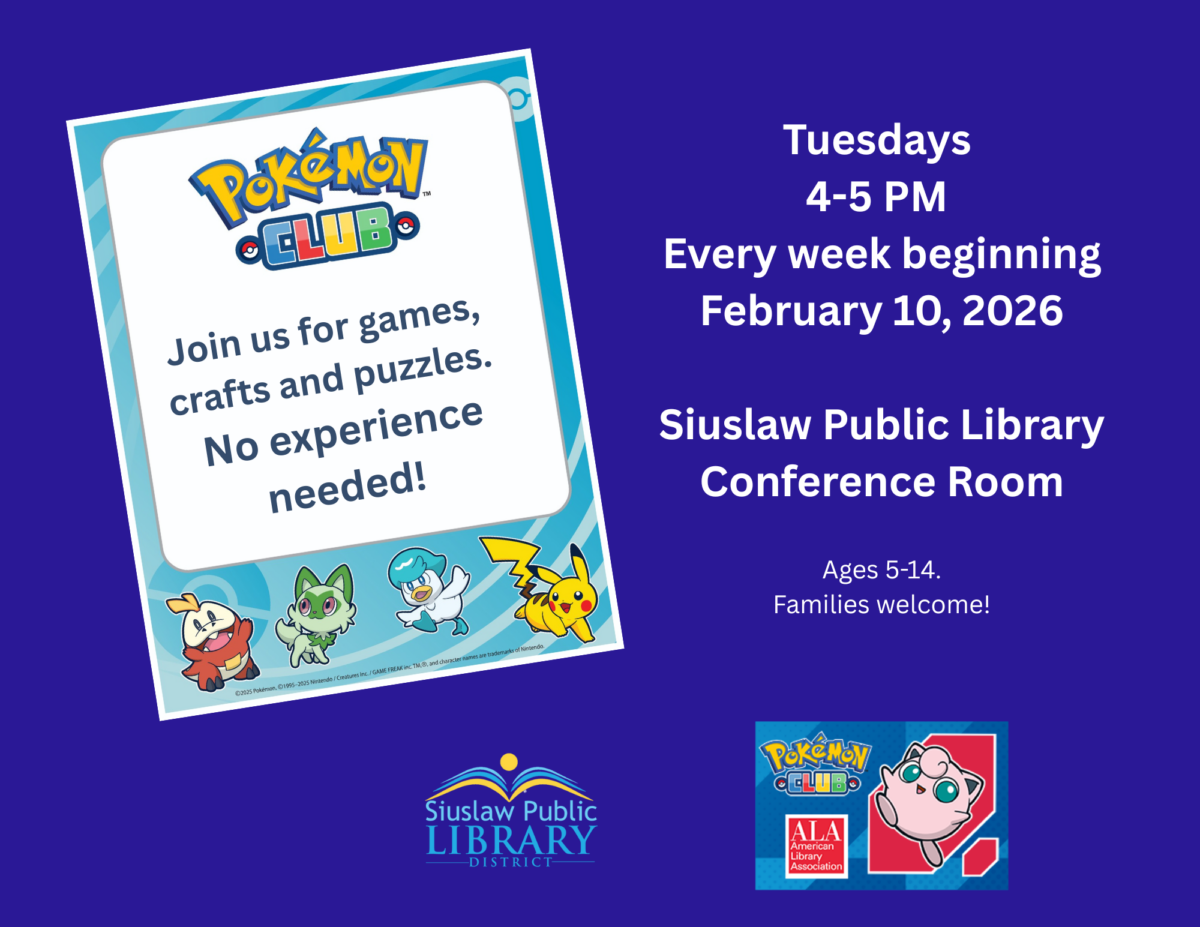 Join us every week for Pokemon Battle Academy, crafts, and other themed activities. Recommended for ages 5-14; families welcome.