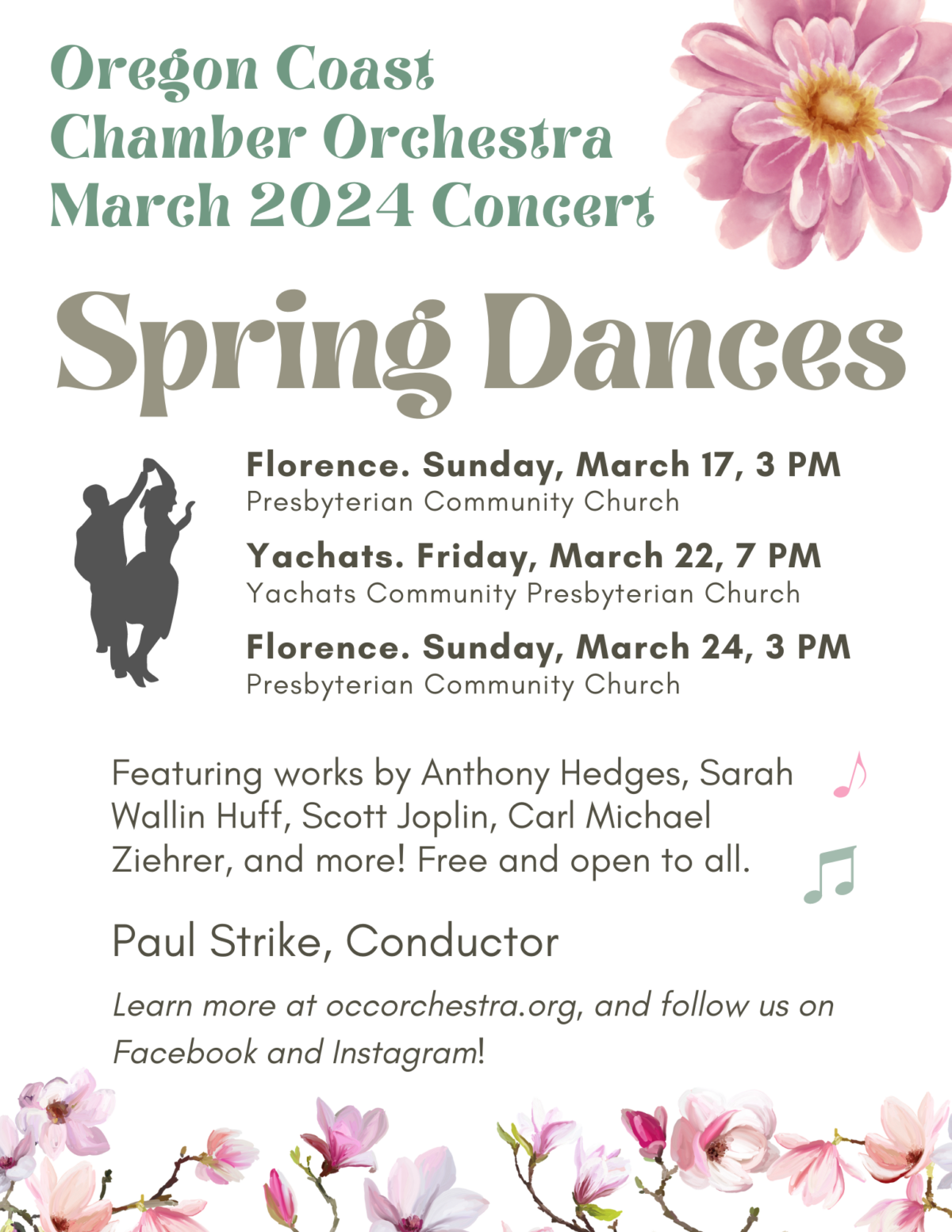 Join the Oregon Coast Chamber Orchestra for “Spring Dances”, a free concert series featuring classical, jazz, Broadway, and more. Free and open to all ages.