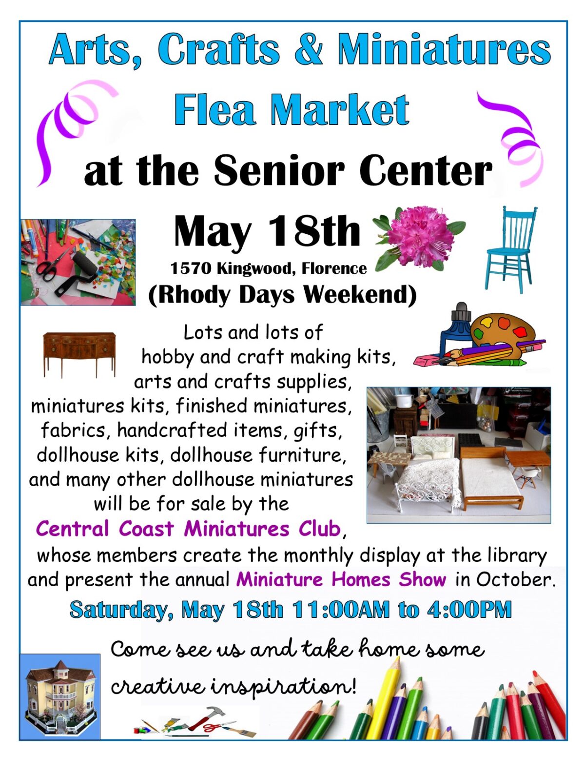 Come visit the Arts, Crafts & Miniatures Flea Market at the Senior Center located at 1570 Kingwood, Florence, on Saturday May 18th (Rhody Days weekend). There will be lots and lots of hobby and craft making kits, arts and crafts supplies, miniatures kits, finished miniatures, fabrics, handcrafted items, gifts, dollhouse kits, dollhouse furniture, and many other dollhouse miniatures will be for sale by the Central Coast Miniatures Club, whose members create the monthly display at the library and present the annual Miniature Homes Show in October. Come see us and take home some creative inspiration!
