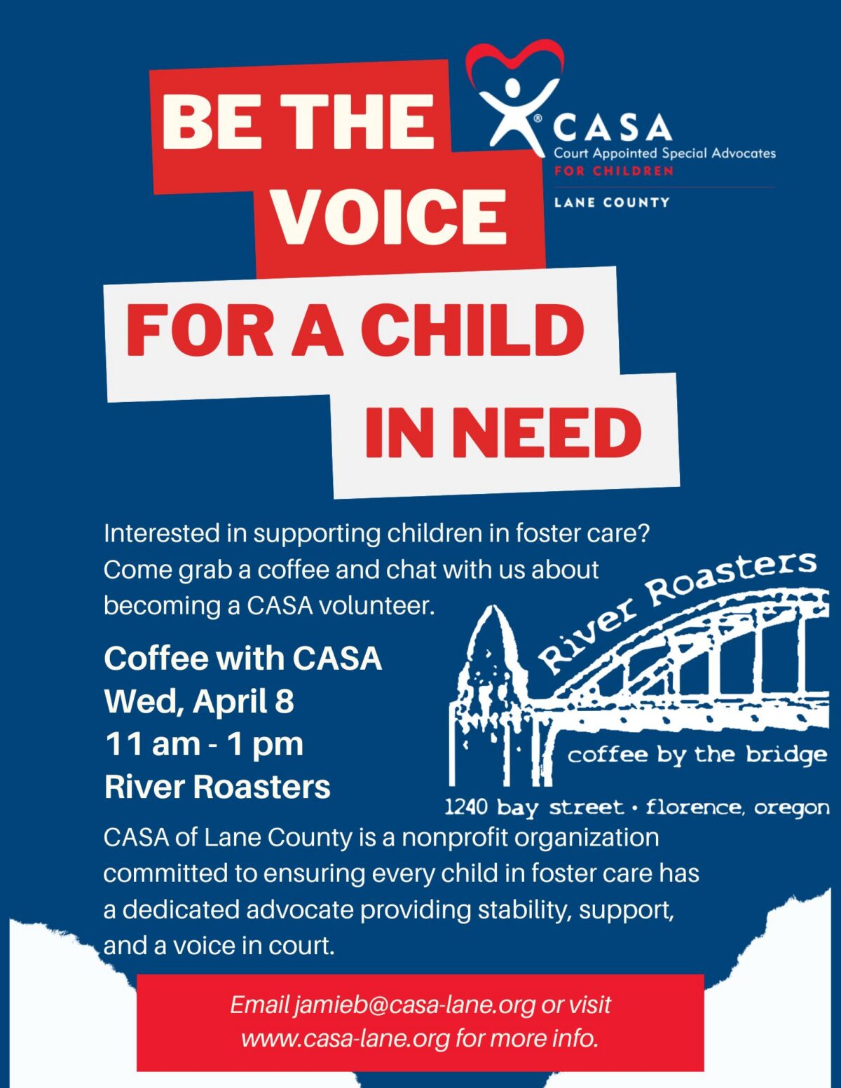 Every year in Lane County, up to 1,000 children spend time in foster care. They deserve to have someone in their corner, advocating for their best interests and making sure their voices are heard. Are you interested in learning how you can help? Come grab a coffee from River Roasters and chat with us about becoming a CASA volunteer.