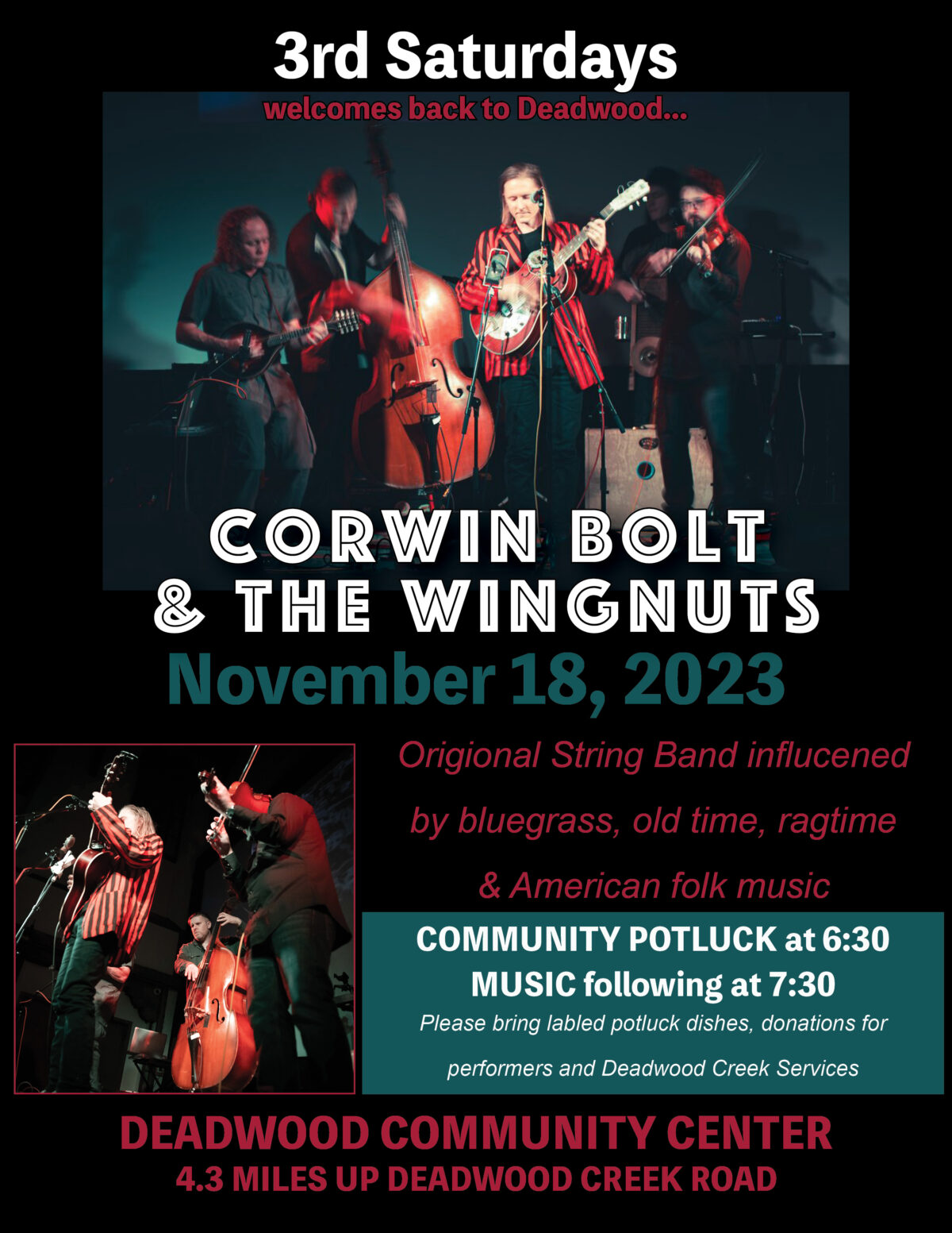 Come out to the Deadwood Community Center for Third Saturday on November 18th! This month we welcome back to Deadwood… Corwin Bolt & The Wingnuts! Community Potluck dinner at 6:30, music at 7:30.